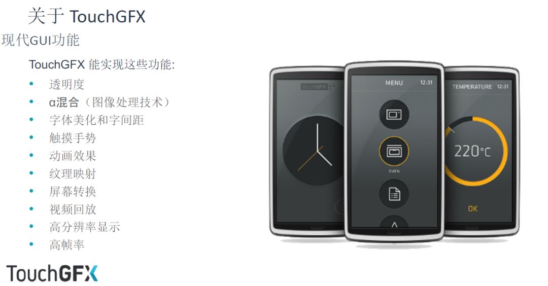 TouchGFX为嵌入式图形用户界面(GUI)提供出色的图形处理性能和流畅的动画效果,同时对资源的需求和功耗极低。TouchGFX运行在32位微控制器上,实现的高端图形处理性能完全媲美今天的智能手机标准,适用于智能家居和楼宇自动化系统、家电、可穿戴设备、音视频系统等各种设备和系统。